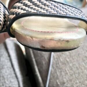 Very nice Isaac Mizrahi New York Isbelle heels! Features a woven black and tan leather strap over foot and an adjustable ankle strap. Made of leather with man made material mix. Gold insole. Overall good condition with mild wear. However, there is some increased wear on the toes. See pictures for details and measurement of heels. Size is women's 8M.