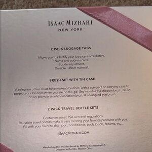 Elegant travel set by Isaac Mizrahi New York. Includes 2 luggage tags, a 5 piece brush set w/case, and 2 travel bottles to put shampoo & conditioner, or lotion into them. Features a stylish accent.