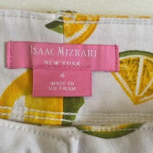 Add a fresh, summery vibe to your wardrobe with these Isaac Mizrahi New York women's shorts in size 6. Featuring a vibrant lemon and green leaf print on a crisp white background, these shorts have a flat front, mid-rise waist with belt loops, side pockets, and a button + zip fly closure. Made from a cotton, polyester, and spandex blend for comfort and a flattering fit.