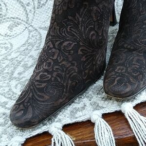 A pre loved pair of ankle booties..inside elasticized ankle.Leather soles , soft suede uppers with a Paisley pattern. Size 9...there is a mfg nail protruding -outer right heel, otherwise a nice wearable and presentable boot. Thesoles have bern professionally conditioned to preserve the leather and enhance appearance. Very clean,comming from a non smoking home.