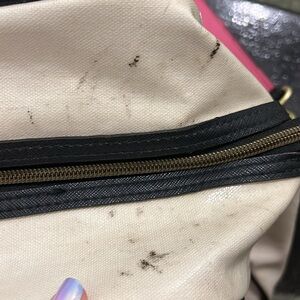 This has been a very loved bag- mainly because it is water resistant. I tried to show all the scuffs in the pics as well as a bit of the pleather coming off on the sides of the strap. It is also missing two of the gold buttons in the bottom. It has an adjustable strap and a pocket in the front. It’s roughly 18x11x9 (at the bottom) despite the cosmetic flaws, there is a lot of life left in it! The inside has two zip pockets and is fairly clean- there aren’t any marks that I see. Questions? Leave a comment below!