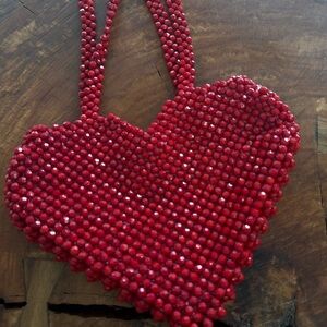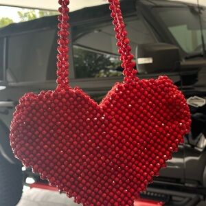 Stylish handbag with vibrant red beads. Features a pink interior. Ideal for a bold fashion statement.