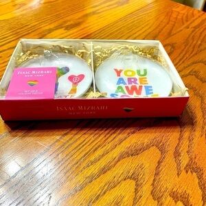 These Isaac Mizrahi New York glass ornaments are fabulous for Christmas, Pride month or all year round. One ornament says “No Hate” and the other says “You Are Awesome”. They are new, in a sealed box. Perfect for gifting or keeping for yourself.