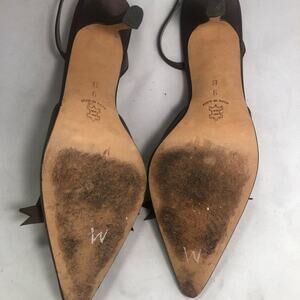 Excelled Pre-owned condition. Chocolate Brown Satin Heels from Isaac Mizrahi. Satin fabric all around with mink pom pom detail on the front area. Satin bow detail at the front. Size 9. Made in Italy. Shoe style is called Sidra. Not in Box. No dust bag.