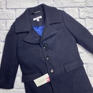 Size 3 Isaac Mizrahi Single Breasted Wool Overcoat in Navy. Stunning. High Quality. Button Front Closure. Notch Collar. Shoulder Epaulets. Adjustable Back Waist Tab. New with Tags.