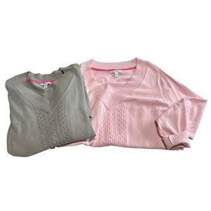 Stay cozy and stylish with this V-neck cable knit sweater. Available in soft pink and gray. it's perfect for any casual outing. Super soft. One of these have been worn once and the other has never been worn. These are nice and oversized with a pit to pit measurement of approximately 24 1/2 inches to 25 inches.