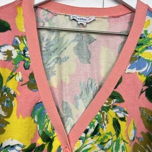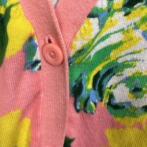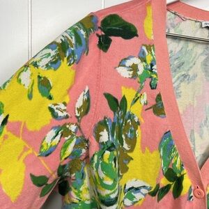 Isaac Mizrahi Womens Cardigan S/M Pink Yellow Green Floral Print 3/4 Sleeves Ribbed Hem & Cuffs Button Up Cotton Blend Vibrant Colorful Versatile EUC