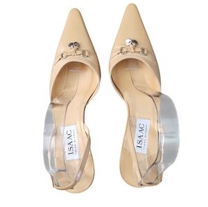 Isaac Mazrahi step in style with these elegant slingback heels size 9.5M. Featuring a chic tan color, these shoes are perfect for any occasion.