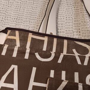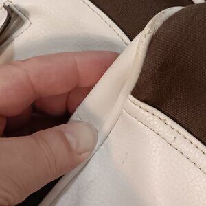 Brown cotton canvas fabric with white faux leather and gold tone logo hardware