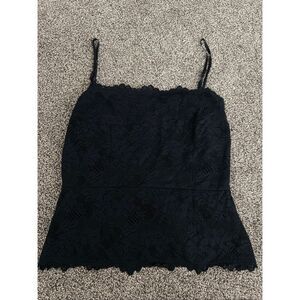 This is a black lace top from Isaac Mizrahi for Target. It features delicate lace detailing, side zipper and adjustable straps, offering a stylish and versatile addition to any wardrobe.