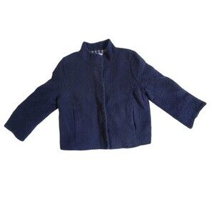 Brand: Isaac Mizrahi for Target. Occasion: Casual. Size Type: Regular. Size (Women's): 8. Material: SHELL: 100% cotton. BODY LINING: 65% polyester 35% cotton. SLEEVE LINING: 100% polyester. Neckline: Band collar. Style: Blazer jacket. F00000476. Sleeve Length: 3/4 sleeves. Color: Navy blue. Pattern: Solid. Features: 2 front pockets. Textured. Notched sleeves. Patterned lining.