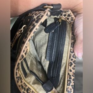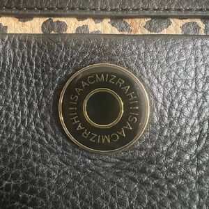 This is a very gently pre-utilized, Isaac Mizrahi genuine pebble leather cross-body bag. It’s embellished with an all-over animal print. On the front is a black leather pocket and a gold- colored zippered pocket. Inside, there is one zippered pocket that spans the width of the bag, as well two smaller, connected loose pockets on the opposite side. The top of the bag has a gold zippered closure. There are no rips, stains or tears.