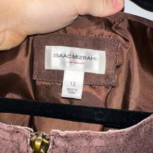 Step out in style with this vintage Isaac Mizrahi for Target brown suede dress. This Y2K mini dress features a scoop neck and sleeveless design, with a zip closure for a sleek and modern look. The dress also boasts pockets for convenience and a touch of personality.