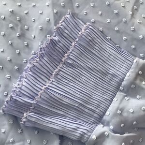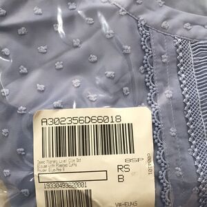 Features: clip dot, split scoop neckline with button closure, double-layered lace embellishment from neckline to hem, sheer sleeves, pleated sleeve cuffs, lined body, side slits
