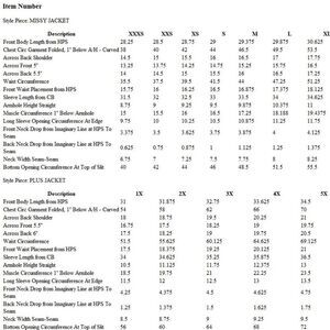 Length: missy length 28-1/2" to 30-5/8"; plus length 31" to 34-1/2"
