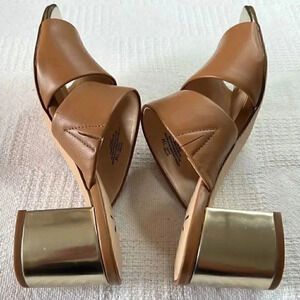Isaac Mizrahi Leather Double Strap Slide Sandals w/ Block Heel Gold size 7m