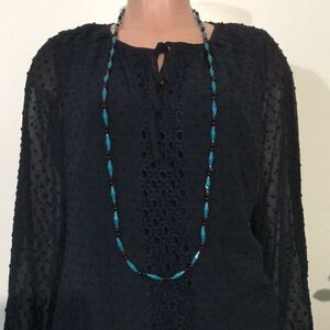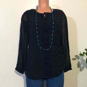 Features: Swiss dot detailing, scoop neckline with keyhole detail and tie, 3/4-length sleeves, shirring at opening and back neckline, ladder lace on front and back, lined body, unlined sleeves, side slits at hem