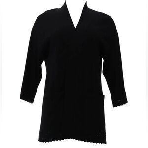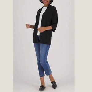 Features: open front; drop shoulders; pockets; 3/4-length sleeves; scallop stitch trim at sleeve opening and bottom hem