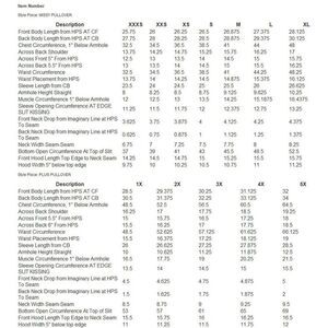 Features: hood with drawstrings, pullover style, ribbed cuffs and hem, straight front hem, curved back hem