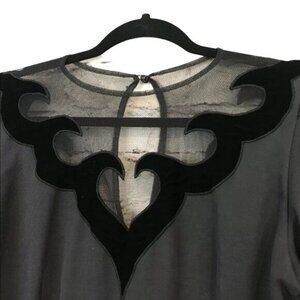 V-neck plunging neckline. Front and back have a semi-sheer mesh across the chest which is outlined by a beautiful, scalloped velvet trim.