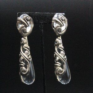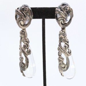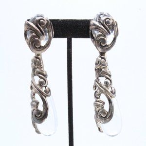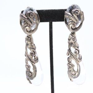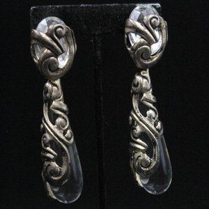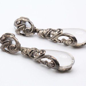 Step into the world of 1980s French Paris Couture with these vintage earrings by Isabel Canovas, a remarkable expression of high fashion and artistry. Crafted during the pinnacle of Canovas's career, these unmarked earrings exemplify her distinctive style. The earrings are a stunning example of statement jewelry, featuring massive long dangles adorned with clear tear-drop-shaped lucite encased within intricately designed silver-tone metal showcasing a mesmerizing swirling pattern. In excellent condition, these earrings boast a clip-on clasp for ease of wear, ensuring both comfort and style. With dimensions measuring 3 3/4" in length and 1" in width, these substantial earrings carry a weight of 25 grams, solidifying their presence as a true masterpiece of vintage elegance.