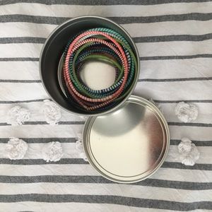 Multi colored stackable bracelets. Plastic feeling striped bangles. From a boutique in MA