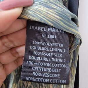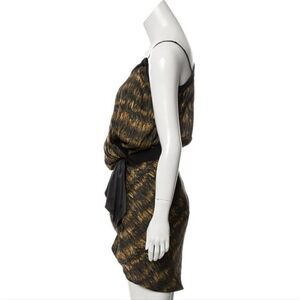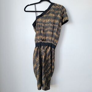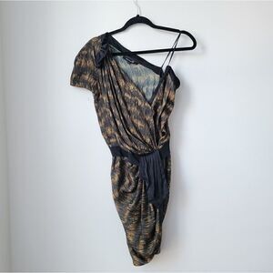 Ochre and multicolor Isabel Marant asymmetrical over the knee-length dress with abstract print throughout, surplice neck, pleated accents at shoulder, short sleeve, grosgrain trim at waist and concealed hook-and-eye closures at front.