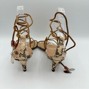 Strappy lace up gladiator sandal from Isabel Marant. Python reptile print with tan straps. Beads and silver tone accents. Calf velvet leather strap. All leather construction. Open toe. Tie lace up ankle. New with box and dust bag. The box and dust bag have some marks to the outside. The dust bag is clean inside. There is one charm missing as shown. They should have 1 on one side and 3 on the other but one shoe has only two instead of three. You would not notice when they are on.