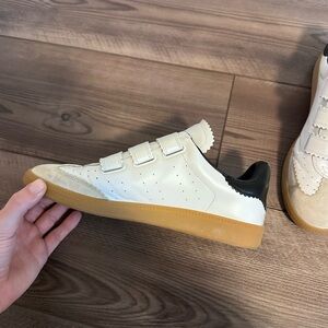 Stylish sneakers with Velcro straps. Features a white tan and black color scheme. Small mark on suede of right shoe shown in photos.