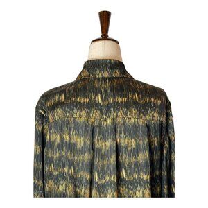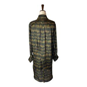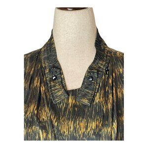 This dress by Isabel Marant is in great condition. It is in allover striped, geometric print in black and gold colors. It features; split neckline, long sleeves with button cuffs, pleated details, mini length and is made with 100% polyester.