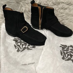 Isabel Marant black suede ankle boots with gold buckle and gold side zipper. These are in excellent condition! Very rare and gorgeous! Size 6.5