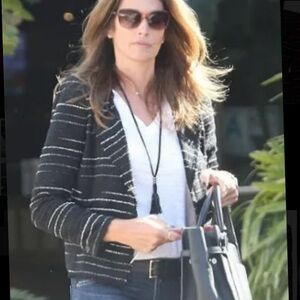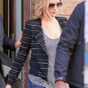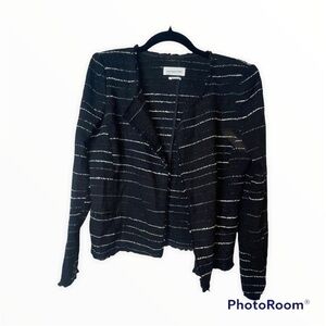 open front jacket, striped tweed texture, tailored fit, medium weight layering piece, versatile black blazer, refined casual jacket, Parisian chic style, sophisticated outerwear