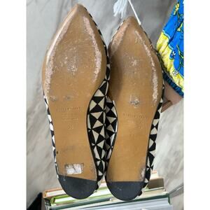 Very good condition, upper is pristine, sole shows light wear. Pointed toe, black and white geometric canvas.