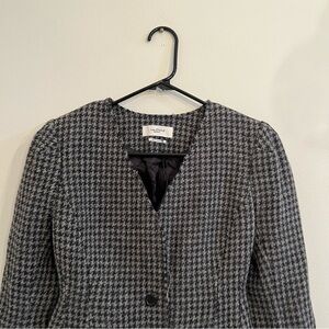 Crafted from soft wool blend. This tonal grey and black houndstooth patterned jacket features a v-neckline, frayed edges, a front button fastening, long sleeves, thin padded shoulder, cropped length and two front pockets.