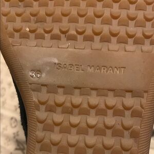 These Isabel Marant sneakers feature a sleek black suede upper with a contrasting brown rubber sole, offering a stylish and comfortable fit. The high-top design extends above the ankle, while the hidden wedge provides a subtle lift. Perfect for adding a touch of elegance to your casual ensemble. Size 36/6