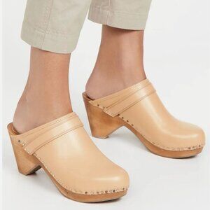 "NEW" Gorgeous Creamy Beige/ Tan Leather Tholas Clog By Isabel Marant. Made in Portugal, Slip on Style, Strap & Nail Head Accents, Almond Toe, Buffed Calf Skin Leather Upper & Curved Wood Foot Bed, 1" Wood Platform & 3" Heel with Rubber Grip Soles, Metal Logo Plate at Back of Heel, New, Never Worn, Only Tried On:) Rt.590.00 approx. Size 40/ 9, Foot Bed Measures 10" for Reference. * Perfect Neutral Shoe for all Seasons!