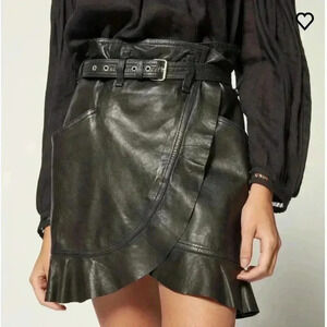 Elegant mini skirt with a belt and ruffled hem. Crafted from dark leather for a sleek look.