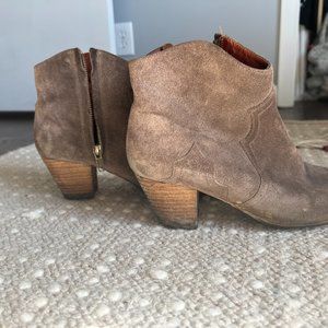 Awesome distressed taupe (grayish-brown) suede “The Dicker” booties by Isabel Marant. Size 39, which should be size 9, Some wear as pictures show, Leather uppers are intentionally distressed and in great condition. Inside zip. Stock photo shown in different color to show style