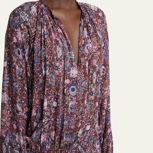 A striking, artistic geometric-floral print defines the design—an evocative harmony of soft purples, blues, russet, and crisp white. The neckline is softly gathered, completed by a slender tie detail, accentuating the piece's air of understated luxury. Channeling Marant Etoile’s signature style, the Bess Dress is the ideal statement for women who cherish individuality, comfort, and exquisite craftsmanship.