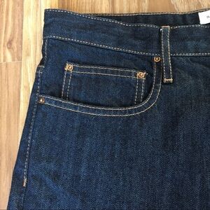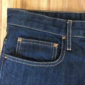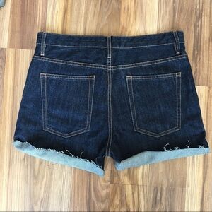 Dark blue wash, zip fly, raw hem. Size 36 converts to a size 4 or 27 waist but please refer to measurements. Waist 16 1/2", length 13" rolled up, rise 11", inseam 3 1/2". Excellent pre-owned condition. Hip area approx 19"