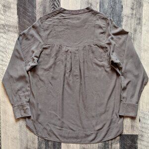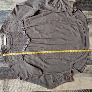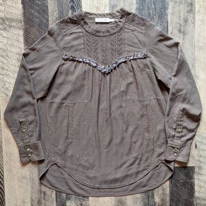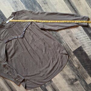 This is an Isabel Marant Etoile Florent shirtdress in the brown/tan color Bronze. It is in excellent pre-owned condition. It is an EU38 aka US size small, and the last three images show measurements. Mini length, long sleeves with double-button barrel cuffs, round neck with embroidered binding, embroidered insets at shoulders and chest, viscose fringe detailing at front yoke, vertical welt pockets at hips, curved shirtwaist hem, soft fabric made of 54% viscose and 46% cotton. Style it as a mini dress or a tunic top.