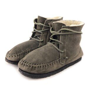 Leather Upper. Sheepskin Lining. Rawhide Lacing. Natural Crepe Rubber Outsole. Whipstitch Moc Toe.