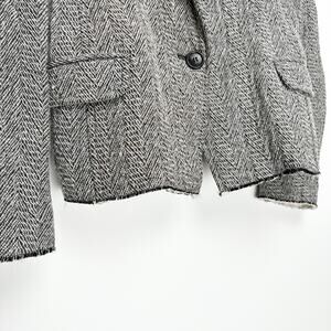 Beautiful herringbone patterned blazer by Isabel Marant. Wool blend giving it warmth in the cooler months. Single button closure in the front and two flap pockets when worn like a blazer. Hidden second button under the collar can close the blazer completely giving it more of a jacket look and feel. Raw hem detail giving the blazer some character. The softness of the lines gives this blazer a very feminine look.