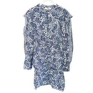 Isabel Marant Etoile Lexini Dress in Blue. Size. FR 36 / US 4 / S / Small. Features paisley print throughout, partially lined, hidden side zipper closure, front key hole with button closure, center ruched detail, ruffle trim, fitted silhouette, mini length. 100% cotton. Style 21ARO2008-21A026E. Excellent used condition, no notable flaws. Light wear on exterior of one cuff closure.