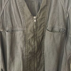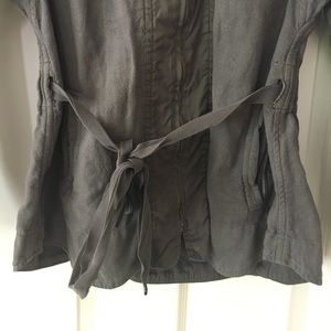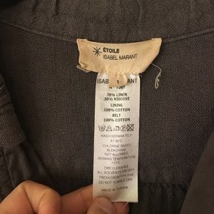 Isabel Marant Etoile Linen Jacket. Dark khaki color Linen and viscose Jacket. Bracelet length sleeve. Zip front and cotton tie belt. Roomy fit through shoulder reflects the style. 4 pockets and great detail. So cute thrown on with anything and has a very iconic to the designer feel. In good condition. Slight pulling in Linen on right underarm area.