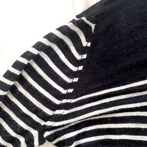 This navy and off white top is very lightweight. The photo of it on the hanger shows the fineness of the weave and its slight bit of sheerness. It fits a Medium or Large, and the length hits above the hip. It’s a loose and boxy cut but with a nice drape… great tucked into high waisted jeans or slacks. It has a dropped sleeve with nice detail. Great condition.