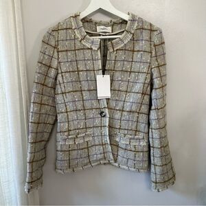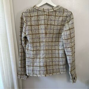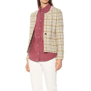 Textured wool-blend, ecru-hue checked collarless blazer jacket