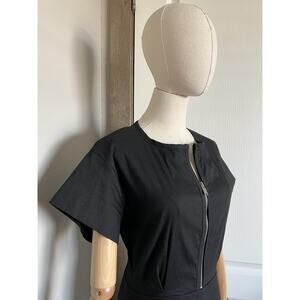 Looser top, fitted bottom, stretchy, zippers in front and back.