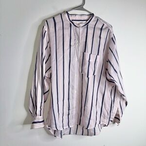 Long sleeve woven cotton and silk-blend shirt striped in pink, navy, and shades of grey. Band collar. Button closure at front. Patch pocket at chest. Single-button barrel cuffs.