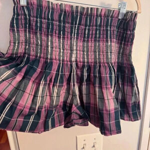 Paneled with shirring through the high-rise waist and patterned in stylish check.